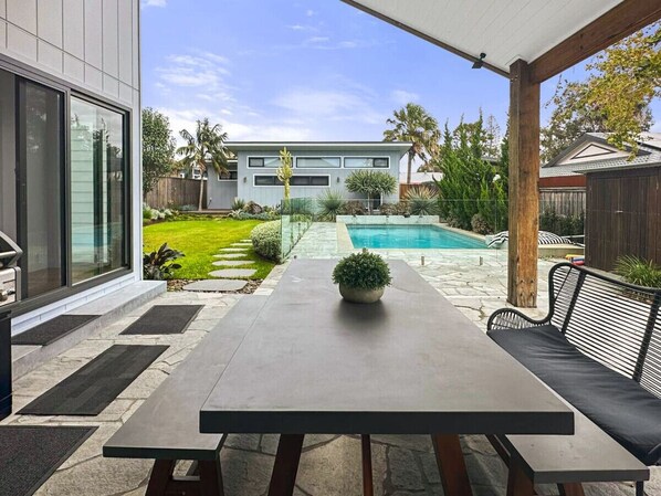 Escape to Superhostly - 'Private Coastal Oasis', a spacious retreat nestled in Long Jetty. Unwind by the private pool, indulge in alfresco dining on the patio, or explore nearby beaches and parks within walking distance. With six bedrooms and ample living spaces, this residence is perfect for large groups or special gatherings.