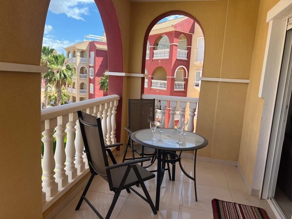 The apartment has an outdoor terrace with a small dining area for you to enjoy throughout the day.