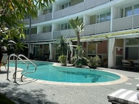Yes, this property has an outdoor pool. Pool access is from 9 AM to 8:00 PM.