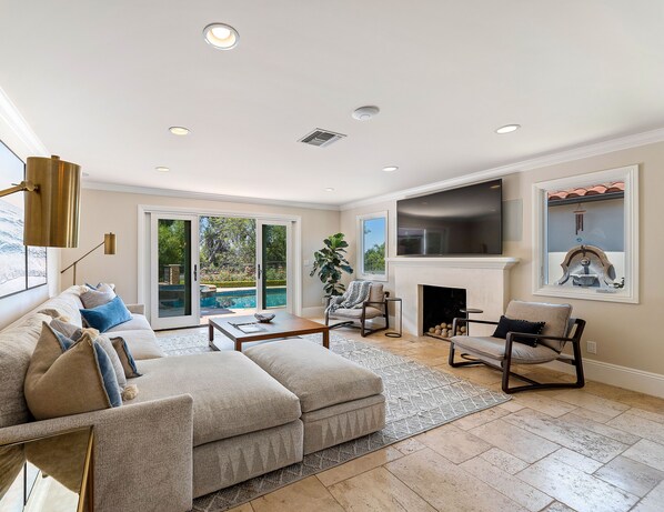 The kitchen includes professional-grade stainless-steel appliances, a large refrigerator/freezer, and a separate beverage fridge inside the home. In the living room, there is a comfortable couch, upholstered chairs, and TV. The family room features a large sectional, television and gas fireplace.