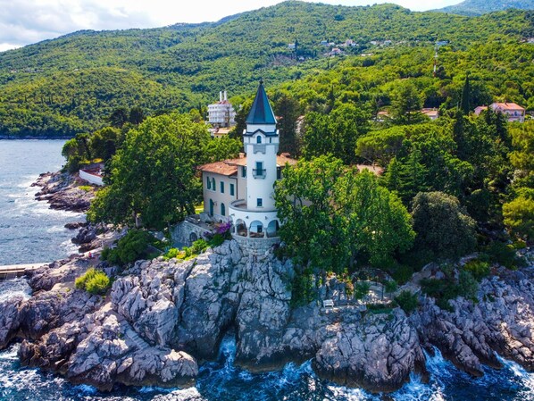 Medveja 3 km from Lovran: Apartment house "Lilly 2". 50 m from the sea, 50 m from the beach, direct access to the beach. For shared use: property 900 m2 (fenced) with plants and trees. Arbour (10 m2), garden furniture, barbecue. In the house: internet access. Parking at the house on the premises. Shop 300 m, supermarket 3 km, restaurant, bar, café, bus stop 300 m, pebble beach "Medveja" 300 m, shingle beach "Medveja" 300 m, rocky beach 50 m. Sports harbour 300 m. Please note: Property ref. HR3056.101.1 is situated on the same property. 4-room apartment 90 m2 on 1st floor. Living/dining room with cable TV (flat screen), air conditioning. Exit to the balcony. 2 rooms, each room with 1 french bed (160 cm, length 200 cm). 1 room with 2 beds (90 cm, length 200 cm). Open kitchen (1 hot plate, oven, 3 gas rings, toaster, kettle, microwave, freezer, electric coffee machine). Shower/WC. No heating option. Balcony 25 m2. Balcony furniture. Marvellous panoramic view of the sea. Facilities: washing machine. Internet (WiFi, free). Garage (1 car). Please note: non-smoking house.