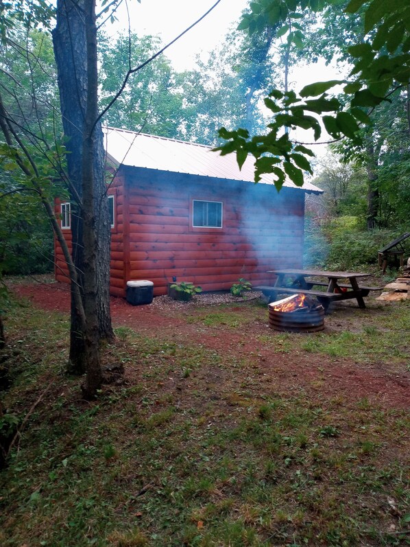 Cabin is rustic with solar lights and propane heat. There is no bathroom or kitchen inside the cabin, however there is a common area kitchenette and bathroom/shower. The cabin has its own fire ring and grill. Each stay comes with a free gift.