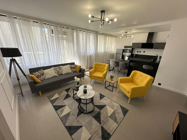 🛋️ A bright and welcoming living space ✔️ Spacious, light-filled living room ✔️ Comfortable sofa, two armchairs, flat-screen TV 📺 ✔️ Direct access to a pleasant balcony, ideal for coffee breaks or aperitifs 🍷 A warm atmosphere, perfect for relaxing after a day in Lyon