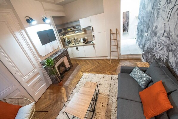 ✔️🛋️ Optimized living space with a 140x180 cm sofa bed, two windows overlooking a parking lot, and a decorative fireplace ✔️🍴 A fully equipped kitchenette with a small refrigerator, induction hob, microwave, Nespresso coffee maker, electric kettle, and toaster ✔️🚿 A large bathroom with a shower, sink, and storage unit, and a washing machine