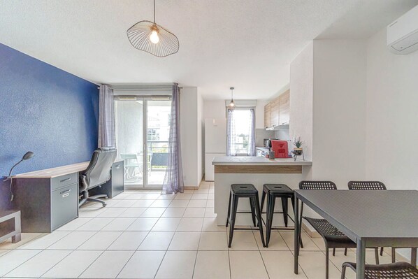✔️Living room: Bright and welcoming, flat-screen TV, and direct access to the balcony. ✔️Open-plan kitchen: Equipped with everything you need to cook like at home: stovetop, refrigerator, oven, microwave, dishwasher, Nespresso coffee machine, toaster, kettle, dishes, and kitchen utensils. ✔️Dining area: Dining table with chairs for sharing meals in a friendly atmosphere. ✔️Office area: Ideal for working from home or studying. ✔️Furnished balcony: With a table and chairs to enjoy the sunny days. ✔️Two comfortable bedrooms: Each equipped with a double bed (160x190 cm), storage cupboards, and bedside tables. ✔️Bathroom: with bathtub, sink, storage unit, and heated towel rail. ✔️Separate toilet.