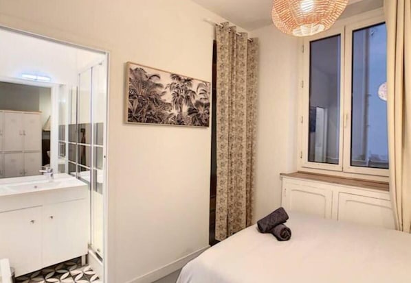 The apartment includes the following amenities: ✔️Spacious living room with warm parquet flooring, ideal for relaxing or working, decorative fireplace, TV, and sofa. Large wardrobe and closet. ✔️Separate bedroom with comfortable bedding and a window overlooking the courtyard, 140 x 190 cm double bed, storage closet/wardrobe, and cabinet with lockers. ✔️ Ensuite shower room. ✔️An open-plan, fully equipped kitchen: oven, large refrigerator/freezer, stovetop, dishwasher, dishes, and kitchen utensils. Nespresso machine, kettle, and toaster for breakfast ✔️Dining area adjoining the kitchen with a high table/bar and 4 stools ✔️Separate toilet ✔️Washing machine ✔️Blackout curtains
