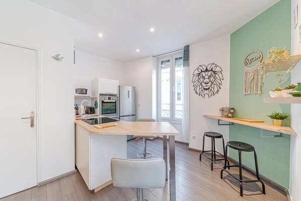 A kitchenette equipped with a large fridge, oven, stove, microwave, dishwasher, Nespresso coffee machine, kettle, toaster, dishes, and kitchen utensils; a dining area with high stools.