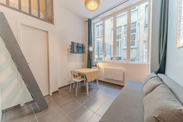 Charming, renovated studio with a mezzanine, perfect for two guests seeking a cozy, well-equipped space. The bright living area includes a comfortable sofa, and the open kitchenette is fully equipped, featuring a Nespresso coffee machine, kettle, toaster, and everything you need to cook. There’s a table with two chairs. The mezzanine offers a separate sleeping area with a double bed (140x90 cm); please note the limited ceiling height. The modern bathroom has a shower, a sink with storage, and a toilet. The studio also provides essential household equipment such as a vacuum cleaner, blackout curtains, and some cleaning supplies. A portable fan, mop, and a few cleaning products are also available.