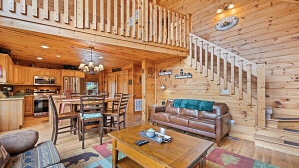Once inside, the main floor opens to a large open living room featuring beautiful stone wood burning fireplace with plenty of comfortable seating, featuring overstuffed couches and chairs. Adjacent to the living space is a 6-person high top dining table for meals or family game time. The open kitchen is fully stocked with your favorite cooking utensils and appliances. Adjacent to the kitchen on the main floor is the primary queen bedroom, primary full bath with tub shower combo and adjacent washer and dryer laundry area.