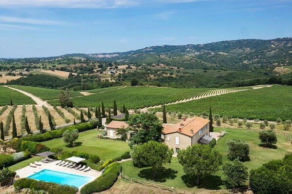 White Retreat is a lovely 8-bedroom villa that offers guests 2 of the most famous characteristics of Tuscany: the amazing views over the hills and the vineyards, and the sandy Mediterranean beaches of the Maremma. The property has a 12-acre estate with olive groves and a large garden with a huge private swimming pool (14x7 meters) set on a sun terrace with lovely views over one of the best pieces of countryside in Italy.