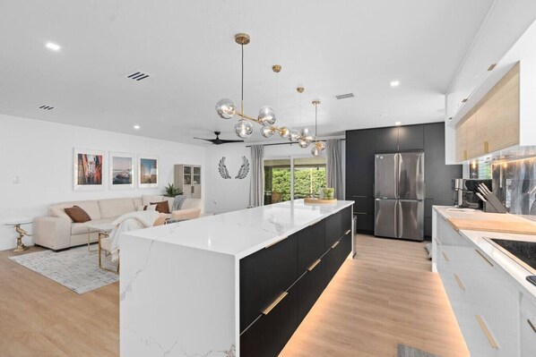 Indulge yourself in the custom gourmet kitchen that is fully stocked to bake bread or whip up an Italian feast on the glass Induction cooktop. Or if you consider yourself a grill master, fire up the Weber Grill and hang outside. Inside the dining room sits 8 guests, and 5 others can gather around the 9+ foot island to eat and hang out. Take turns on the full body massage chair and Zen out for a 20-minute cat nap to repower up from your day or stretch with some yoga.