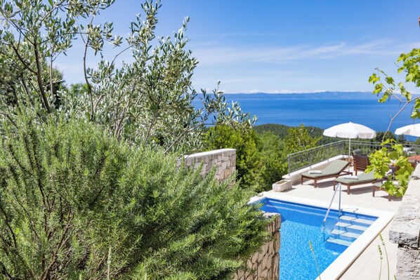 Wir waren kurzentschlossen auf der Suche nach einer Unterkunft mit Meerblick und mussten uns daher auf die Bewertungen unserer VormieterInnen verlassen. Diese Unterkunft liegt absolut idyllisch und bietet wirklich alles, was man für einen rundum gelungenen Urlaub braucht: Dadurch dass die Unterkunft in den Ausläufern der Berge liegt, bietet sie beides -- einen Blick auf das Meer und die Inseln mit regelmäßig traumhaften Sonnenuntergängen und genauso einen Blick auf das beeindruckenden Bergpanorama! Mit dem Auto ist man in ein paar Minuten in der quirligen Stadt Makarska oder dem idyllischeren Tulcepi, wo man von ausgezeichneten Restaurants bis zu Bars und großen Supermärkten alles findet. Daneben kann man vom Haus zu verschiedenen Wandertouren unterschiedlicher Schwierigkeit aufbrechen -- sei es durch die Berge oder zu malerischen Buchten und Stränden abseits von Makarska. Und natürlich sind die bekannten Nationalparks in erreichbarer Nähe wie auch Split und die Inseln mit einer Tagestour mit einer der Fähren. Das Haus selbst entspricht in Sauberkeit und Einrichtung mühelos einem sehr gutem Hotel-Standard und versprüht zudem den Charme eines modern restaurieren authentischen Gebäudes. Der private beheizte und nicht einsehbare Pool und die beiden zum Entspannen einladenden Terassen geben einem oft genug gar keine Gründe, das Haus zu verlassen. Ansonten ist das Haus sehr sauber und lässt z.B. auch in der Küche kein Utensil vermissen. Die Gastgeberin ist äußerst zuvorkommend, immer hilfsbereit und stets auf das Wohl ihrer Gäste bedacht -- und wir durften uns über ein Starter-Paket im Kühlschrank freuen. Unser Gesamtfazit: Absolut empfehlenswert!