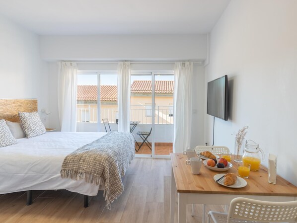 The studio has a double bed, a private balcony, TV, fully equipated kitchenette and a complete bathroom.