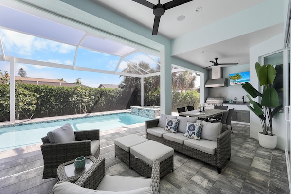 Near South Marco Beach, 2023 Custom Built Home With Heated Pool and hot tub provides everything you need.