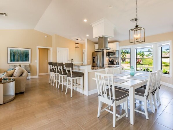 The lanai features a seating area and outdoor eating space that is covered. It also has a brand new grill and a wonderful heated pool. The entire lanai is enclosed with a picture frame pool screen. Steps lead down to the water and a dock. It's a beautiful outdoor space and a perfect place for friends and family to gather. Close to shops, restaurants, and the new Publix. It's an easy bike ride to the beach just down San Marco Rd. Grab one of the bikes provided for a ride. Beach chairs, cooler and toys are provided.