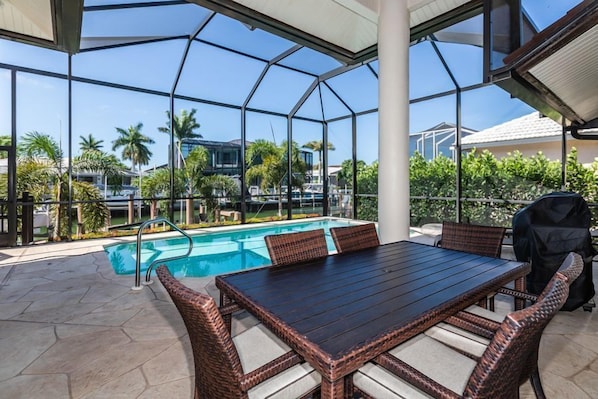 Escape to a beautiful three-bedroom home with southern exposure, offering a heated pool and tile flooring throughout. Located near Marco Library, Mackle Park, and the YMCA, this property is perfect for families. The kitchen boasts stainless steel appliances and granite countertops.