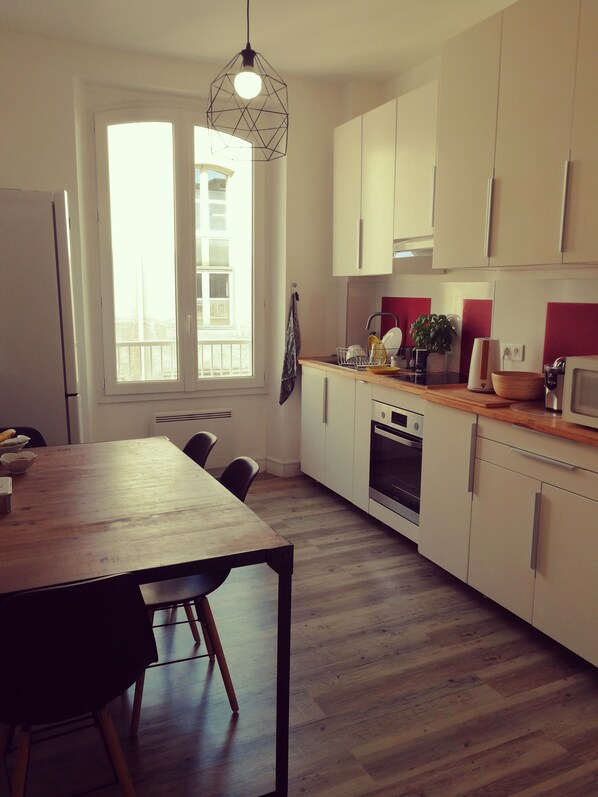 The appartment offers lots of space and a fully equipped kitchen. Several restaurants and cafes are nearby (we recommend the one in the same building), the old port is just a short walk away.Camille met us at our arrival, showed us around the appartment and also had a recommendation concerning eating dinner around the port.