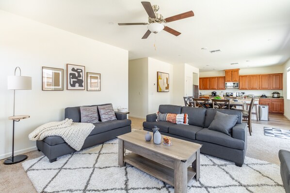 The living room is both comfortable and roomy, featuring a light grey couch