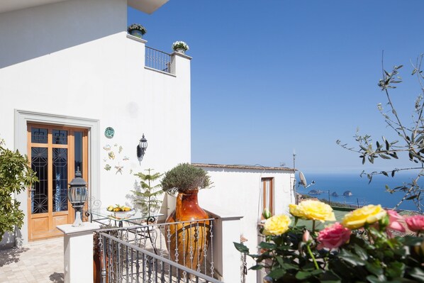 THE APARTMENT FLOWER is a beautiful studio apartment of 45m2, recently renovated and consists of 1 room divided into a sleeping area with double bed with canopy and seating area with table and chairs, fully equipped kitchen, 1 bathroom (with shower tub) and terrace with magnificent sea views and outdoor furniture. It is located on the 1st floor of the Villa. THE APARTMENT FLOWER has an extremely elegant and refined, embellished with majolica of Vietri sul Mare made and painted entirely by hand. It can accommodate up to 3 people and offers every kind of comfort: air conditioning, heating, flat-screen TV, Wi-Fi Internet, shared laundry, drying rack, iron and ironing board, hairdryer, cot (on request).