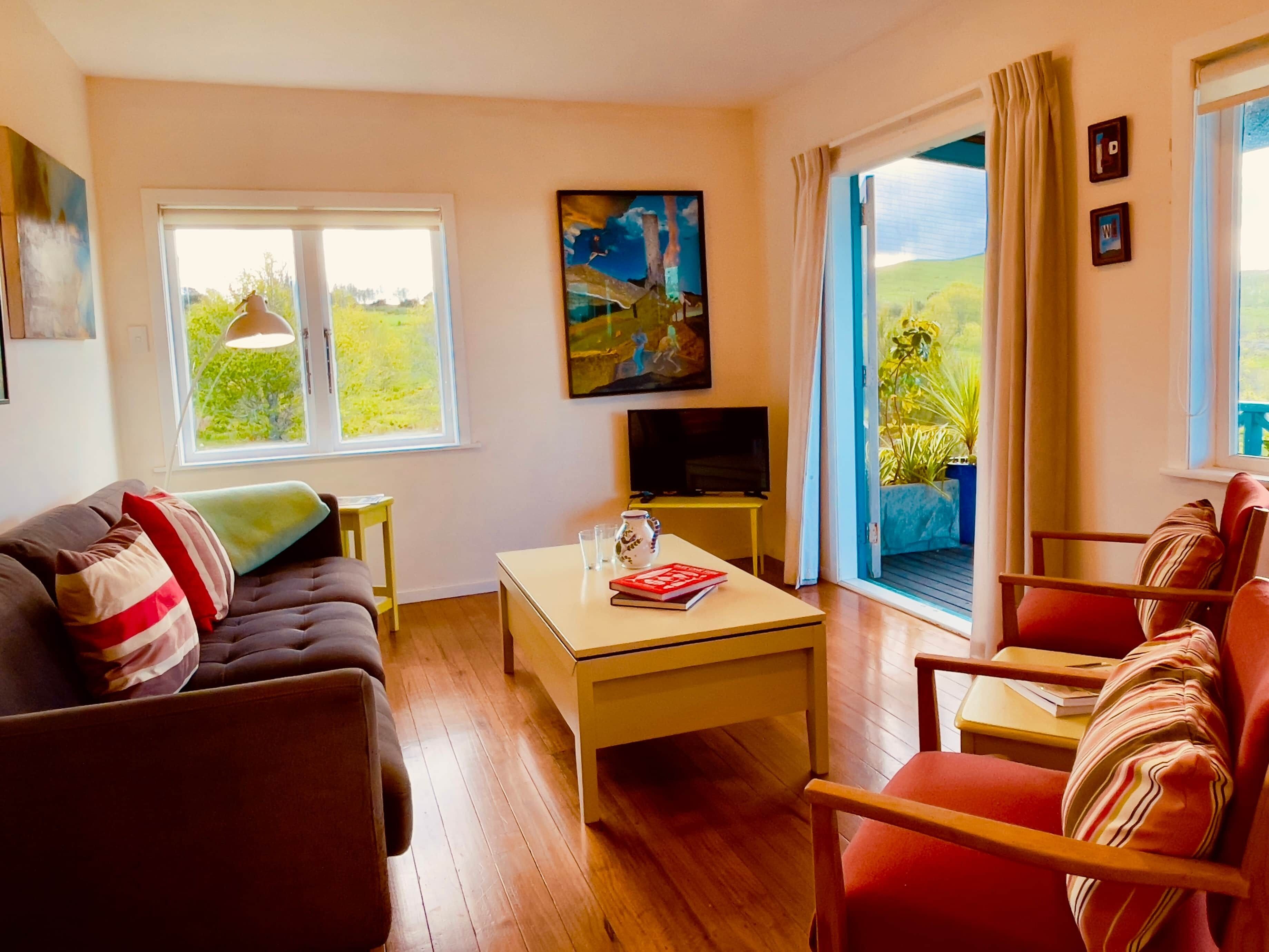 Inside, polished wooden floors and cosy furnishings create a warm, comfortable space. Enjoy a couch and daybed, TV, art-filled walls, and a selection of books. Beds are made with 100% cotton bedding and wool duvets for a great night’s sleep.