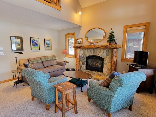 Inside, the main floor features a cozy primary bedroom with a queen bed, and an adjacent bathroom featuring a tub/shower. The open plan living space offers a warm and inviting atmosphere, with a picturesque view of the meadow and Goat Wall through the wall of windows. Curl up on the couch or one of the two easy chairs arranged around the cozy gas fireplace.