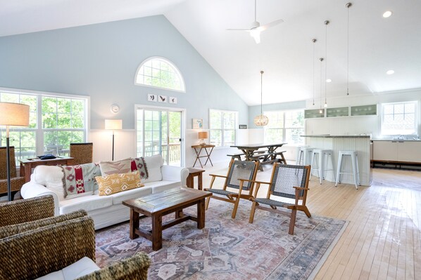 A light-filled Great Room with a brand new kitchen (all-new for 2026!) and sliders that open onto a massive wraparound deck with plenty of seating.