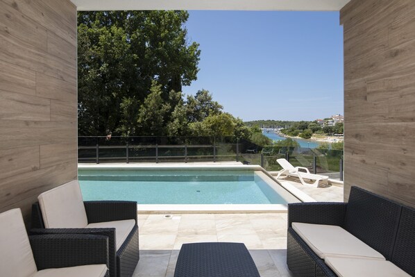 Experience the epitome of luxury at Apartment David, nestled just 50 meters from the sea. This modern retreat boasts a spacious living room, dining table for 6 people and a fully equipped kitchen. Step outside to unwind by the private pool or relax on one of four deckchairs.