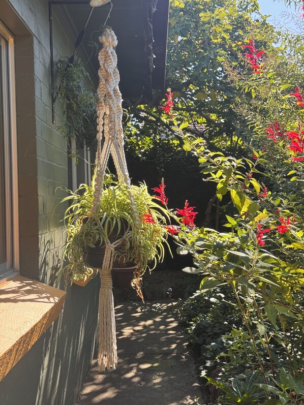 Experience a cool, east-facing bungalow set in the back garden of the main house, with views over a lush herbaceous perennial garden filled with flowers, birds, and fruit trees including figs, lemons, tamarillo, pomegranate, and raspberries. Inside is a spacious room with mid-century modern furniture, including Australiana shell art, vintage Japanese plates, string and embroidery craft work from the 1970s. There’s also a desk with a swivel chair, fast internet, ideal for work or relaxation.