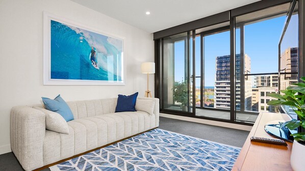 Both bedrooms are set up for restful nights, each featuring a queen bed and good storage. The apartment includes two bathrooms, making it a practical option for couples, friends, or colleagues travelling together.