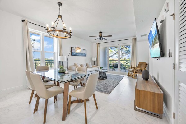 Relax in the beautifully designed living area, complete with tile flooring, a 65-inch Smart TV, and modern furnishings that create an inviting space for unwinding. The large windows offer stunning views of the nature sanctuary and Banana River, ensuring a serene and private retreat throughout your stay.