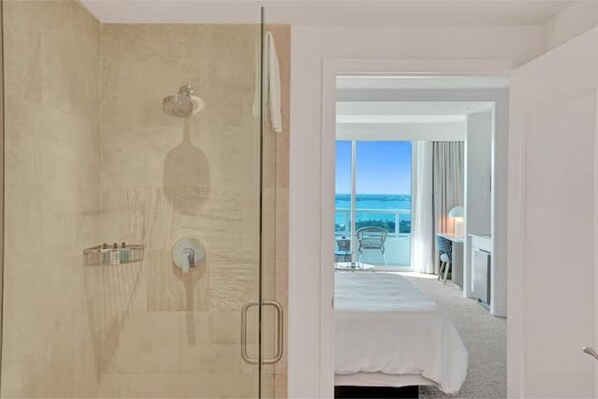 Travelers find Miami Beach luxury on the 33rd floor of Fontainebleau's Junior Suite. Enjoy a king-size bed, Jacuzzi, and extra-large private balcony with stunning views. Includes two Lapis Spa passes, access to seven pools, and super-fast WiFi.