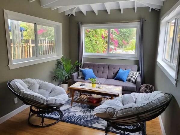 Detached guest house with its own entrance. Inside, you'll find over 600 square feet of private space, including separate bedroom, living room, and dining areas. Plenty of room to stretch out and relax after splashing around in the pool right outside your door!