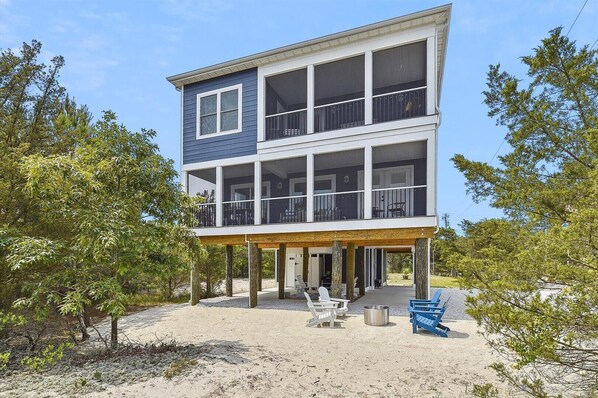 This stylish new Broadkill Beach house is designed for comfort and loaded with amenities. 5 bedrooms (2 with king beds), 5 bathrooms, and a large fully equipped kitchen. The two covered screened porches provide great spots to gather - even on rainy days! Whether you’re spending time together in the spacious living areas or retreating to your comfortable room, this attractive house offers everything you need. Located on the beach block, just a few houses from the bay, you'll be dipping your toes in the water within minutes of heading out the door. External cameras in use. Linens are not provided, but can be rented from local companies. Make your holiday one for the books with a stay at our place.