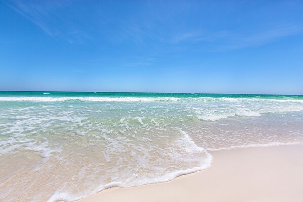 This newly renovated home is located perfectly in the heart of Miramar Beach and offers great views of the beautiful sugar white sands and emerald hues of the gulf. The main living area is open and has a wall of sliding doors that provide the spectacular views from the inside of the home and easy access to the home's large balcony. The living area has a flat screen TV and a nearby comfy plush sofa. The Master Bedroom has it's own private en suite bathroom and a Queen Size bed. It also has a balcony on the beachside. The guest bedrooms share a full bath and both have charming twin size beds that are great for kids!