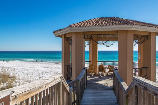 Private beach access is just steps away through a gated pathway, where a Mediterranean-style gazebo with a terracotta roof and Adirondack chairs leads to a pristine stretch of white sand. The community also includes a fitness room equipped with all essentials for a workout with a view, as well as a community grill area, ideal for gathering with family or friends for an outdoor meal. Mediterranea offers a unique retreat where elegance and comfort meet, all within moments of the beach and nearby attractions.
