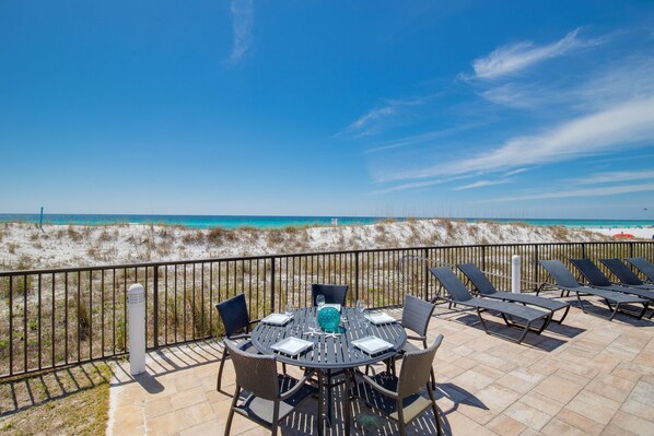 Outdoor dining - "Seasational" Oceanfront, 1st Floor Penthouse, Gated Community, Pool (Miramar Beach)