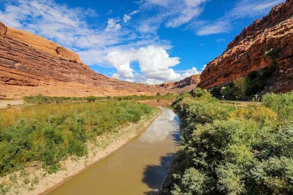 Title: Spacious townhouse with shared heated pool, tennis courts, & balcony views Reviews, Deals & Photos 2026 - Expedia.co.uk [See all properties](http://www.expedia.co.uk/Hotel-Search?regionId=&selected=111898480&adults=2&children=&sort=RECOMMENDED&useRewards=false&semdtl=&userIntent=&vip=false) Entire home # Spacious townhouse with shared heated pool, tennis courts, & balcony views Holiday home in Moab with kitchen and balcony ## Photo gallery for Spacious townhouse with shared heated pool, tennis courts, & balcony views ![Outdoor dining - Spacious townhouse with shared heated pool, tennis courts, & balcony views (Moab)](https://images.trvl-media.com/lodging/112000000/111900000/111898500/111898480/e6e284a2.jpg?impolicy=resizecrop&rw=598&ra=fit) ![Dining - Spacious townhouse with shared heated pool, tennis courts, & balcony views (Moab)](https://images.trvl-media.com/lodging/112000000/111900000/111898500/111898480/d71544a4.jpg?impolicy=resizecrop&rw=297&ra=fit) ![2 bedrooms, iron/ironing board, Internet, bed sheets - Spacious townhouse with shared heated pool, tennis courts, & balcony views (Moab)](https://images.trvl-media.com/lodging/112000000/111900000/111898500/111898480/2f8f40d0.jpg?impolicy=resizecrop&rw=297&ra=fit) ![Fridge, microwave, oven, stovetop - Spacious townhouse with shared heated pool, tennis courts, & balcony views (Moab)](https://images.trvl-media.com/lodging/112000000/111900000/111898500/111898480/a0708cb3.jpg?impolicy=resizecrop&rw=297&ra=fit) ![Exterior - Spacious townhouse with shared heated pool, tennis courts, & balcony views (Moab)](https://images.trvl-media.com/lodging/112000000/111900000/111898500/111898480/03285fe8.jpg?impolicy=resizecrop&rw=297&ra=fit) - Overview - Location - Amenities - Policies Spacious townhouse with shared heated pool, tennis courts, & balcony views provides amenities, such as laundry facilities and a hot tub. ## Reviews 10 Exceptional ### Entire home 2 bedrooms3 bathrooms1360 sq ft ## Popular amenities - Pool - Hot tub - Kitchen - Washing machine - Dryer - Air-conditioning ## Add dates for prices Check-in Check-out Travellers ## About this property ### Entire place You'll have the entire home to yourself and will only share it with other guests in your party. ### Spacious townhouse with shared heated pool, tennis courts, & balcony views Rim Vista 13A3 Our calendar is updated in real-time & our nightly rates are accurately displayed. Simply enter your desired dates and click 'Book Now!' Escape to the heart of Moab, Utah, with a stay at this beautifully appointed townhouse, where relaxation meets adventure. Surrounded by Moab's iconic red rock landscapes, this serene retreat offers the perfect balance of comfort and convenience for families, friends, or couples seeking an unforgettable getaway. Spend your days exploring world-renowned destinations like Arches and Canyonlands National Parks, or enjoy the local charm of downtown Moab with its eclectic shops and restaurants—all just minutes away. After a day of adventure, return to the community's seasonal heated pool and year around hot tub for a soothing soak, or challenge your crew to a friendly game on the basketball and tennis courts. The pavilion and play area add extra fun for everyone, making this a community packed with activities for all ages. Golf enthusiasts will love the close proximity to the nearby golf courses, where you can tee off against a backdrop of stunning mountain and desert vistas. Back at the townhouse, unwind on the private balcony with breathtaking views, or fire up the gas grill for an alfresco dinner under the stars. Inside, modern comforts abound with central AC, a fully equipped kitchen featuring stainless steel appliances, and a spacious living room ideal for gathering together. Whether you're savoring the quiet morning air with a cup of coffee, relaxing in the shared hot tub, or planning your next outdoor excursion, this Moab townhouse is the ultimate base for making lifelong memories. With easy access to hiking, biking, rafting, and more, you'll have everything you need for an adventure-filled escape. Reserve your stay today and discover why Moab is a bucket-list destination! Parking notes: There is free parking available for 2 vehicles. Damage waiver: The total cost of your reservation for this Property includes a nightly damage waiver fee, plus tax if applicable (the “Damage Waiver”). (A discount may be applied for stays of 28 nights or longer, if permitted.) The Damage Waiver covers you for up to $3,000 of accidental damage to the Property or its contents (such as furniture, fixtures, and appliances) as long as you report the incident to the host prior to checking out. The Damage Waiver fee eliminates the need for a traditional security deposit. More information can be downloaded from the "Rental Agreement" on the checkout page. Due to local laws or HOA requirements, guests must be at least 21 years of age to book. Guests under 21 must be accompanied by a parent or legal guardian for the duration of the reservation. ## Property amenities ### Pool/Spa - Communal pool - Heated pool - Hot tub ### Internet - Available in the house: Internet access ### Parking and transport - Car required - Parking on site ### Kitchen - Coffee/tea maker - Cookware, dishware, and utensils - Dishwasher - Hob - Ice maker - Microwave - Oven - Refrigerator - Toaster ### Bedrooms - 2 bedrooms - Bedsheets provided ### Bathroom - 2.5 bathrooms - Hair dryer - Towels provided ### Living spaces - Living room ### Entertainment - DVD player - TV with cable/satellite channels ### Outdoor areas - Balcony - Barbecue grill ### Laundry - Laundry facilities - Washing machine ### Comfort - Air conditioning - Heating ### Pets - No pets allowed ### Suitability/Accessibility - Smoke-free property - Note from host: Smoking is not permitted anywhere on the premises. ### Services and conveniences - Iron/ironing board ### Location highlights - In the mountains - Near a hospital ### Things to do