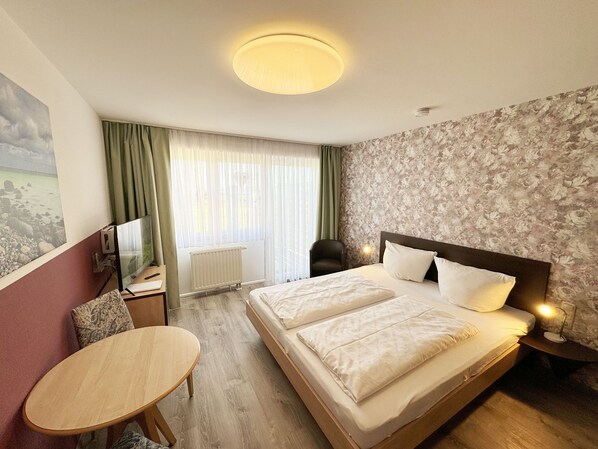 The Non smoking apartment no. 03 in Haus Inselperle offers with its approx. 30 m² space for max. 2 adults. The spacious kitchen and dining area, which you enter through the entrance is equipped with a fully equipped kitchenette with 4 zones ceran stove, dishwasher, oven, fridge freezer, toaster, microwave, kettle and a coffee machine and various small kitchen utensils. An adjoining dining table completes the area. Over the small corridor you reach the inside bathroom which is equipped with toilet, shower, vanity, hair dryer, large wall mirror, towel radiator and a storage shelf. In the following living / sleeping area, which has been completely laid with a high-quality carpet, you will find a large double bed with single mattresses (1.80 mx 2.00 m), bedside tables with reading lamps and a spacious wardrobe with safe for your valuables. The blackout curtains ensure a restful sleep. In addition, there is a sideboard, floor lamp and a small seating available. A 17-inch LED TV and an inclusive Wi-Fi connection complete the technical area. Enjoy your breakfast on your seated patio in beautiful sunshine or the evenings with a cozy barbecue with the available barbecue. A parasol completes your terrace (south / east). Please note, however, that the barbecue on the wooden terraces is not allowed for reasons of fire protection. Here you will find enough space in the outdoor area, which also has a small children's playground, sandpit and a ping-pong table. A pet is a welcome guest with us. Since pets love to love their own things, please bring sleeping pots, water bowls and feeding bowls here. If beach sand gets into your house or falls down a bit, every apartment is equipped with a vacuum cleaner and other cleaning equipment. For your bicycles, you will find a bicycle stand to connect to the gable of the house. The green area of the house invites to convivial evenings with other guests. A car parking space (No. 03) is available to you inclusive at the house. The initial equipment of a linen package (complete bed linen, 1 towel, 1 small towel, 1 bath mat) you can book up to 14 days before arrival for an additional charge or supplement by your own. 1 tea towel is included in every stay.
