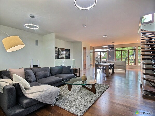 Ce magnifique condo offre 2600 pi² d'espace de vie réparti sur trois étages, ainsi que trois terrasses en cèdre totalisant 900 pi². L'une des terrasses sur le toit est équipée d'un spa pour six personnes. L'intérieur présente un style contemporain rehaussé par la richesse de différentes essences de bois, notamment le cèdre espagnol, le cerisier et le sucupira, un bois brésilien de qualité supérieure. Les trois étages bénéficient de plafonds de 9'4", et un système d'éclairage LED moderne est intégré partout.