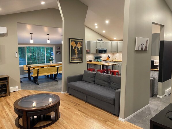The house is very open with a great deck and plenty of couch space for everyone to hang out. The downstairs game rooms are amazing and we took full advantage of the great fire pit area. We had a chance to use the community beach which is also quite nice. We had neither a dog nor children with us but the house and yard are very dog and kid friendly. The hosts were great to work with. We are hoping to rent the house again!