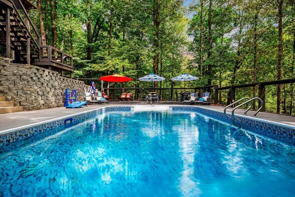 Escape to Riverside Memories in Mt Airy, NC, where a serene riverfront oasis awaits. This log cabin retreat offers direct private access to the Ararat River and features an unheated pool open from May 1-September 30, a hot tub for year-round relaxation, and a game room with board games and arcade fun.