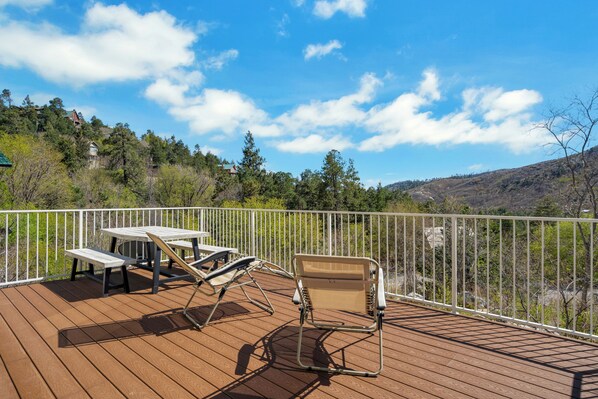The Rose Canyon Lake Cabin in Summerhaven on Mt Lemmon has been decorated with a mountain lake theme décor. The views from the deck have you overlooking all of Summerhaven, Arizona. Bedroom 1 has a king bed with California closet system and bedroom two has a bunkbed with a queen bed on the bottom and twin bed on top. There is a second TV is the bunkbed room with access for electronic games. This is a YEAR round cabin on asphalt county maintained road. We provide shovels and salt in the event you get some fluffy white stuff in the winter. This is the perfect cabin for those of you looking for privacy. This cabin is pet friendly for responsible pet owners and the large deck is completely enclosed. There is a full kitchen for cooking with a table to eat outside and watch the sunset over Summerhaven.