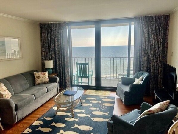 Come Relax on your large private oceanfront balcony with unobstructed views of the ocean. Enjoy the resort amenities, which include 2 pools (indoor and outdoor), hot tub and outdoor kiddie pool, and cornhole. We have an onsite family friendly beach bar and grill that offers a variety of special drinks and food.