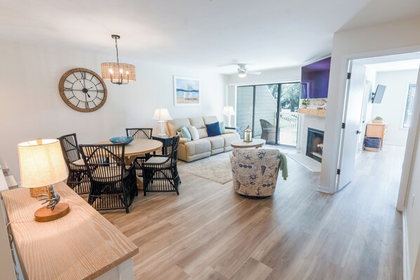 The open‑concept living area is bright and welcoming, featuring updated flooring, comfortable coastal furnishings, and a decorative fireplace that adds charm and ambiance (for display only) ✨. A mounted TV and sliding glass doors invite natural light and provide easy access to outdoor living.
