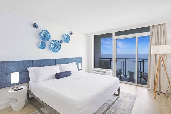 Nestle into the heart of Myrtle Beach with this chic vacation rental, perfectly positioned to offer you an unforgettable seaside escape. This updated 1 Bedroom deluxe suite combines the comfort of a modern fireplace and a plush King bed with the mesmerizing allure of direct oceanfront views from your private balcony. Designed for both relaxation and entertainment, the suite features dual 50” Smart TVs, a fully equipped kitchen for your convenience, a cozy pull-out sofa, complimentary Wi-Fi, and custom lighting—all set against the backdrop of the most stunning beach vistas you can imagine.