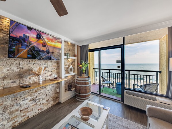 Now for the highlight of the condo, the oceanfront living room. This beautifully styled space combines elegance with coziness. A plush sleeper sofa offers generous seating, paired with a modern accent chair for added comfort. Across from the sofa, a striking brick accent wall adds texture and warmth, with an oversized flat-screen TV mounted for your entertainment. The dining table is tucked neatly into the corner, and nearby, the Murphy bed folds down to reveal a comfortable full-sized bed when it's time to turn in. Unique coastal decor throughout adds charm and character, setting this condo apart from the rest.