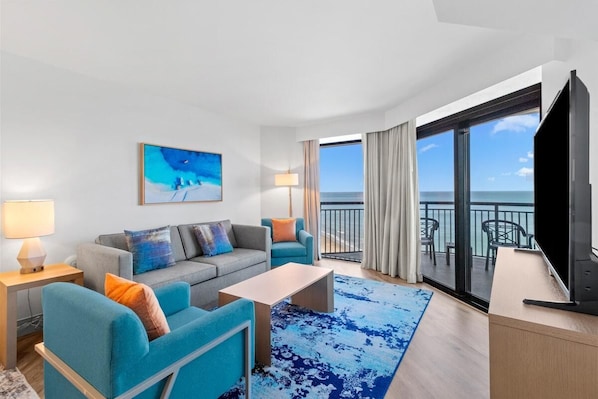 From the 17th floor of Cayman Tower, Oceanfront Four welcomes you to a luxurious coastal retreat with breathtaking panoramic ocean views. This spacious four-bedroom condo boasts elegant accommodations, featuring multiple private balconies and bathrooms. Enjoy wireless internet access throughout the resort and unwind in front of multiple HDTVs.