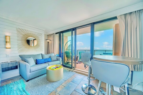 NEWLY REMODLED 2026 CORNER END UNIT ULTRA SIZED BALCONY TERRACE UNIT, NO ONE TO THE LEFT/NORTH. WRAP AROUND PATIO FURNITURE, 2 LOUNGERS,COOLER,60"TV, CUSTOM BUILT ROCK TILE FIREPLACE,HUGE PLUSH KING BED, SLEEPER, GOLD ACCENT FIXTURES, BRAND NEW EXTENDED KITCHEN WITH EXTRA CABINETS AND NEW APPLIANCES, UPDATED BATHROOM