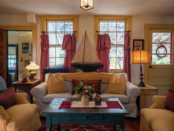 Step into the historic Captain Burrows Home, an antique home with a seafaring past. With water views of Tuft's Cove and a delightful private garden, this charming vacation rental is perfect for family gatherings or friend getaways. Enjoy the fully equipped kitchen, super fast WiFi throughout the home, and cozy living room.