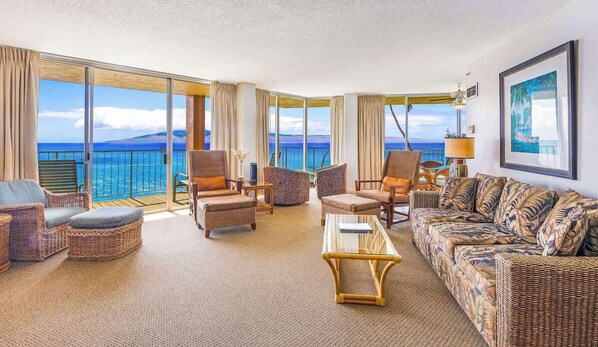 Massive wraparound lanai with panoramic ocean views ā perfect for whale watching, sunsets, and morning coffee.